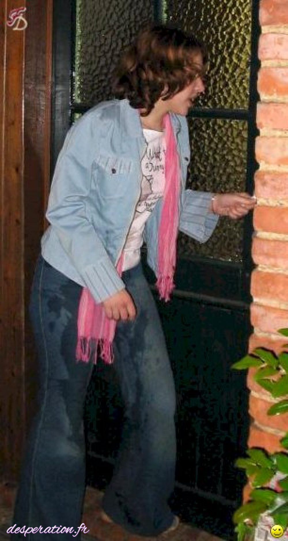 Une auréole de pipi apparaît sur sa culotte trempée dans sa petite culotte devant le regard des passants.