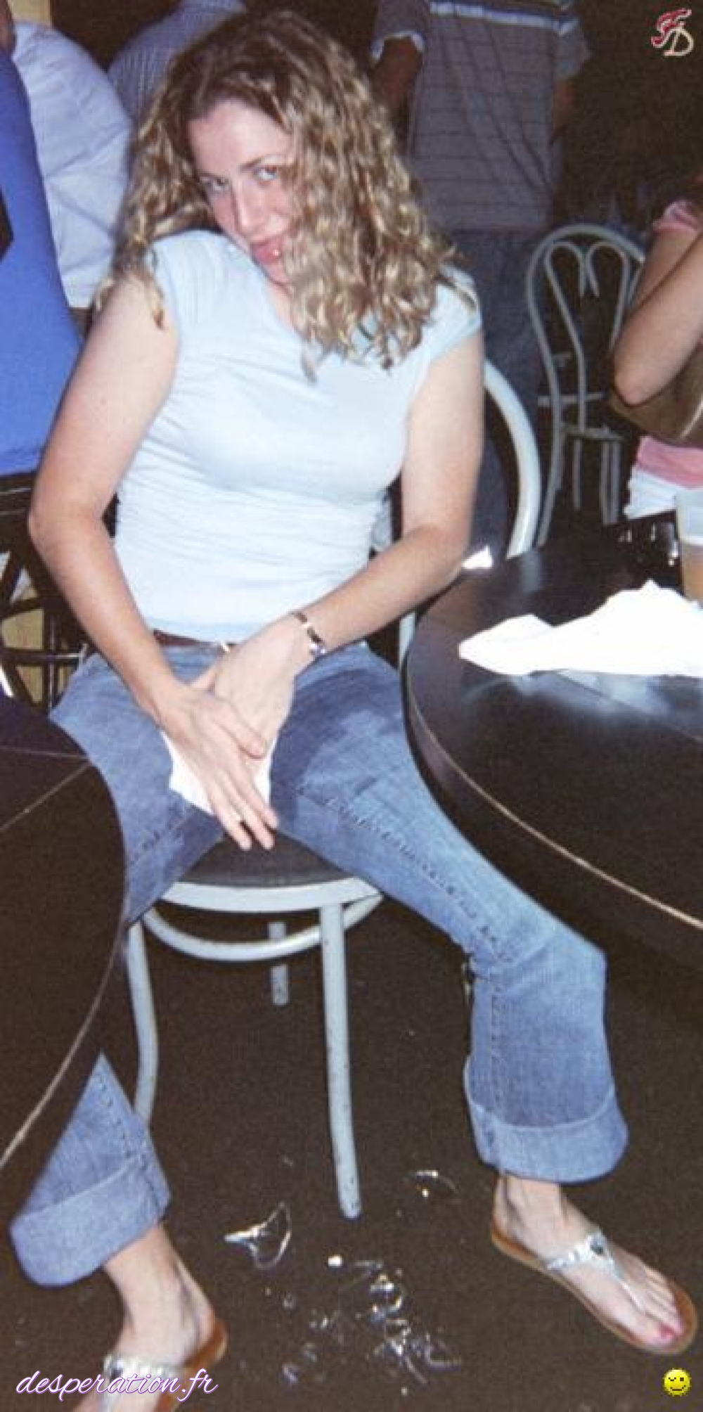 La vessie pleine, elle ne peut se retenir de pisser dans sa culotte devant les gens .