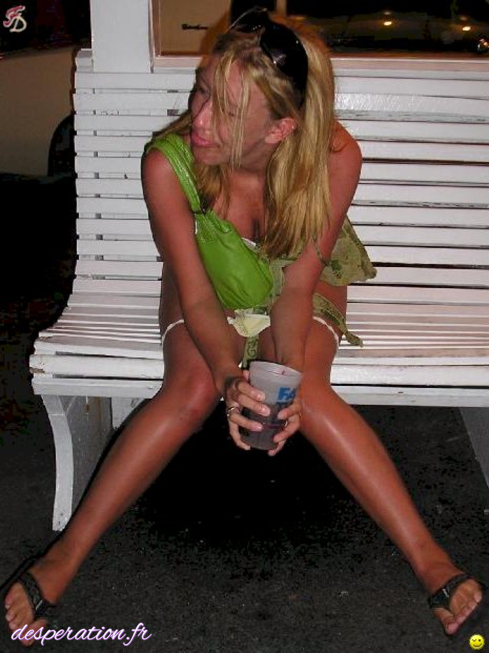 Une miss touche sa culotte toute trempée de pipi dans un lieu public en extérieur.