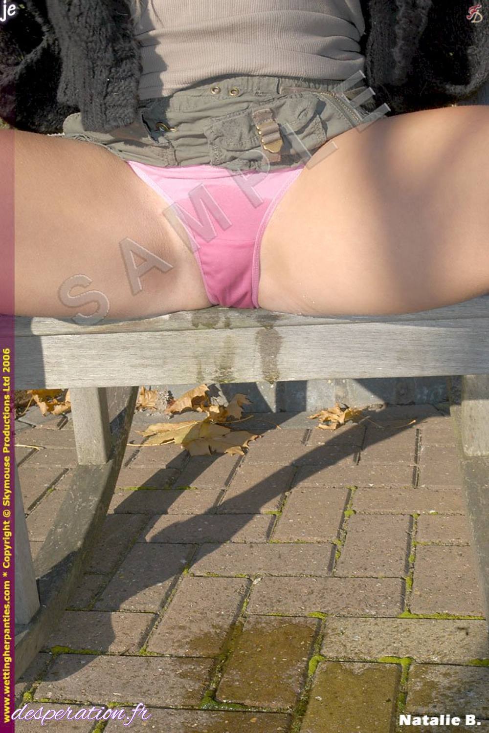 La vessie pleine, elle ne peut se retenir de pisser à travers sa petite culotte fine