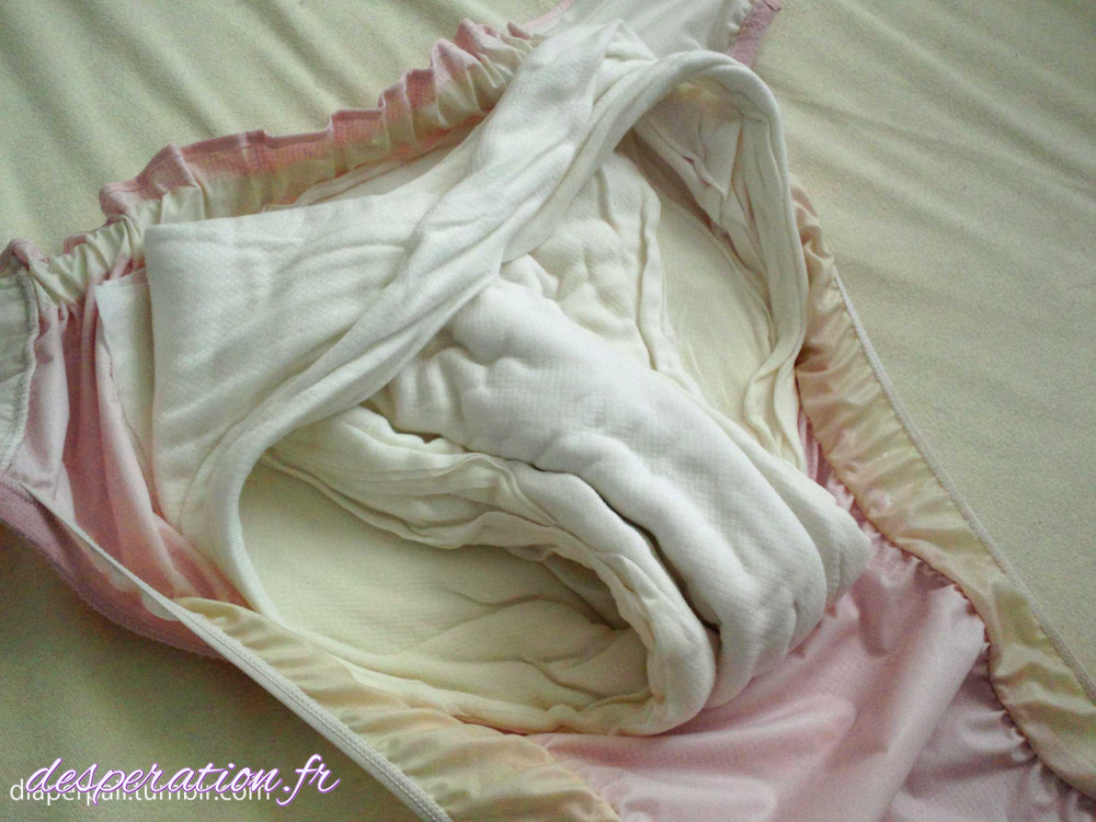 La vessie pleine, elle ne peut éviter l'accidentdans sa couche-culotte souillée.
