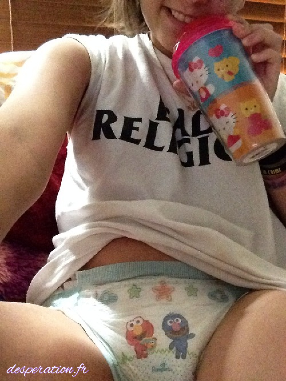 Elle prend un plaisir fou à se pisser dessusdans sa couche-culotte souillée.
