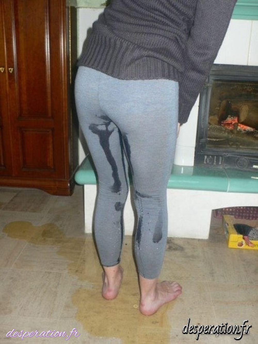 A peine rentrée de son jogging, plutôt que d'aller aux WC, elle opte pour un pipi culotte au coin du feu.