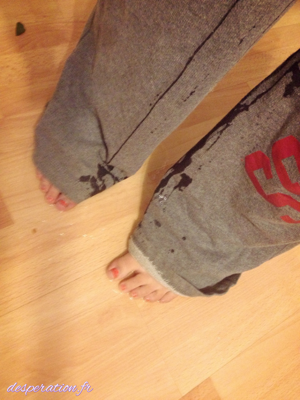 La vessie pleine, elle ne peut éviter l'accident dans son pantalon de jogging souillé