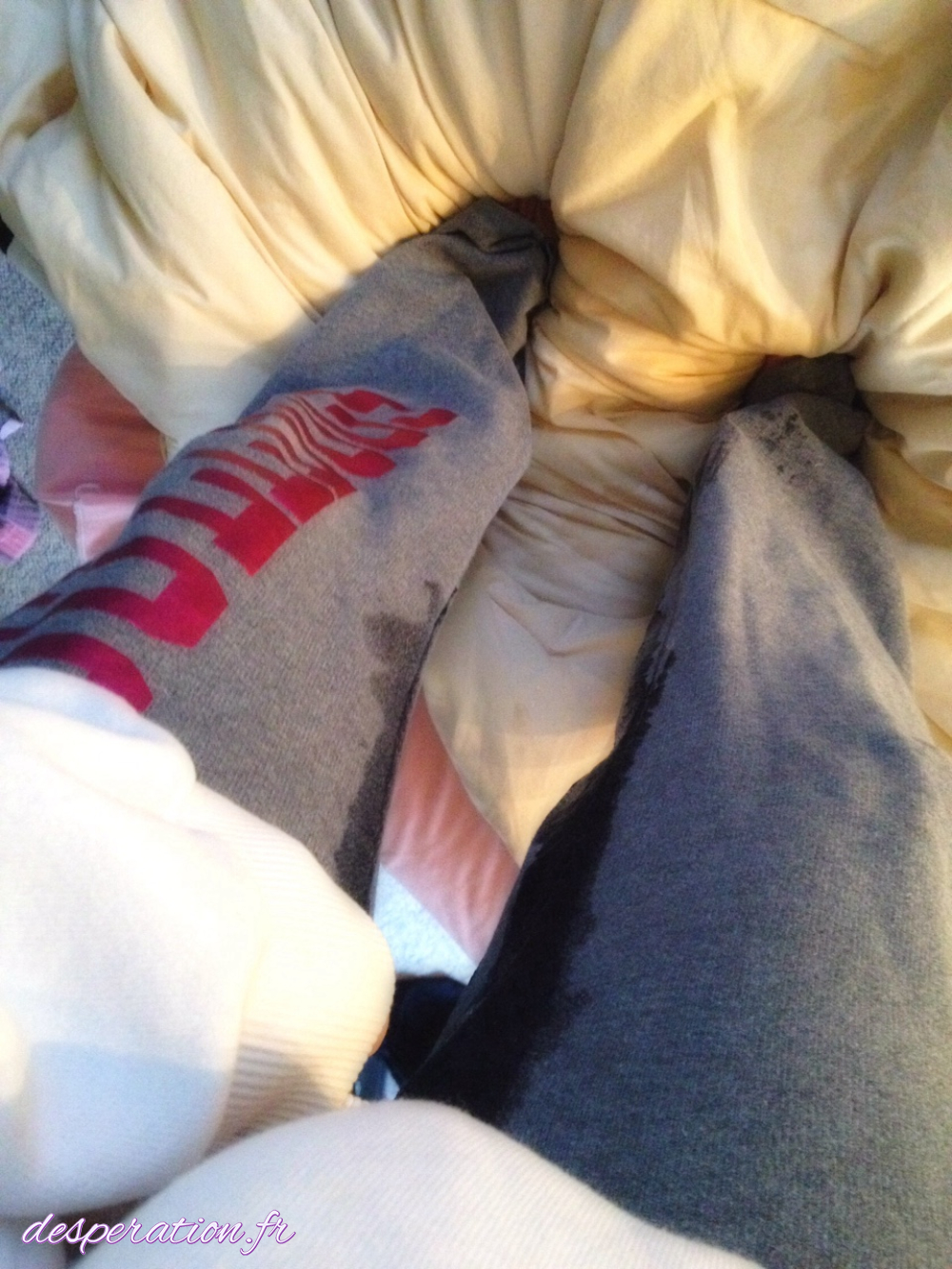 Désespérée, elle ne peut empêcher l'accident urinaire dans son joggin trempé de pipi