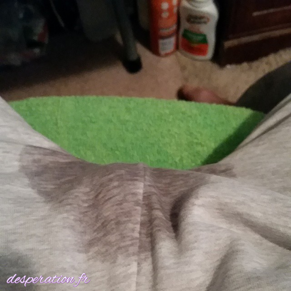 Désespérée, elle ne peut empêcher l'accident urinaire dans son joggin trempé de pipi